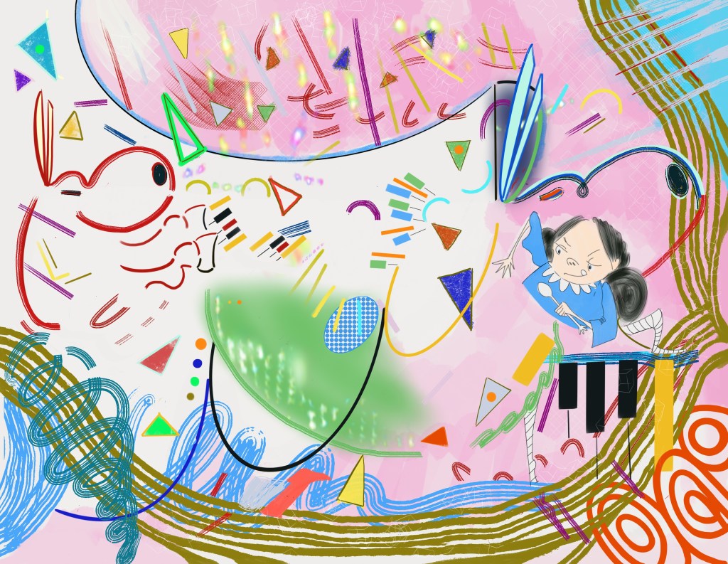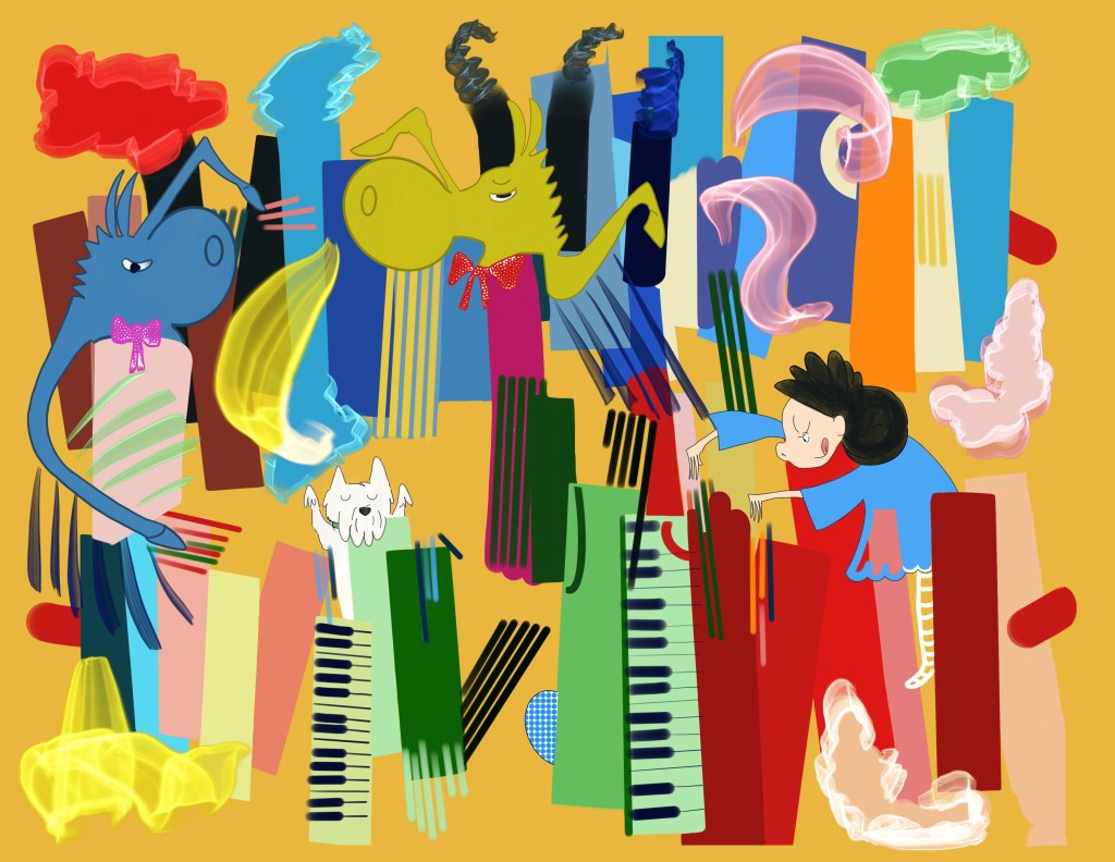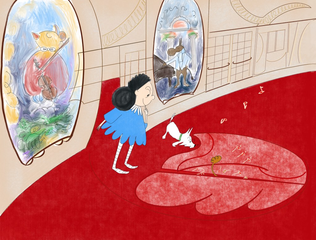 The book follows Fluffy, a young girl and her sidekick Tempo, a west highland terrier dog, in their musical adventures inside Carnegie Hall. The book is accompanied by the colorful and humorous musical suite of Camille Saint-Saëns’ “Carnival of the Animals.” Children are encouraged to listen to the musical suite with 14 different movements while looking through illustrative images as Fluffy’s imagination takes shape. The book also involves the reader/listener in participation with a page for Fossils movement, that involves coloring while listening to the score (available on the provided QR code)